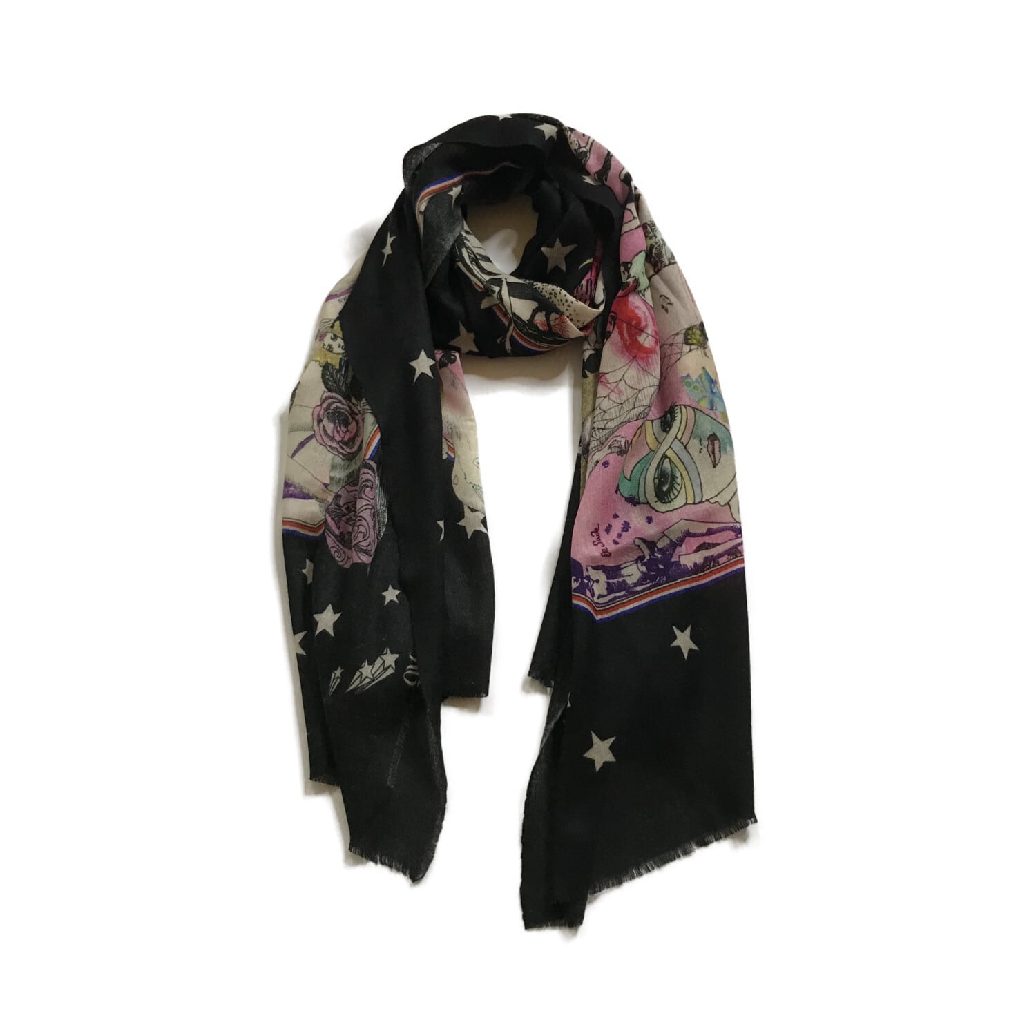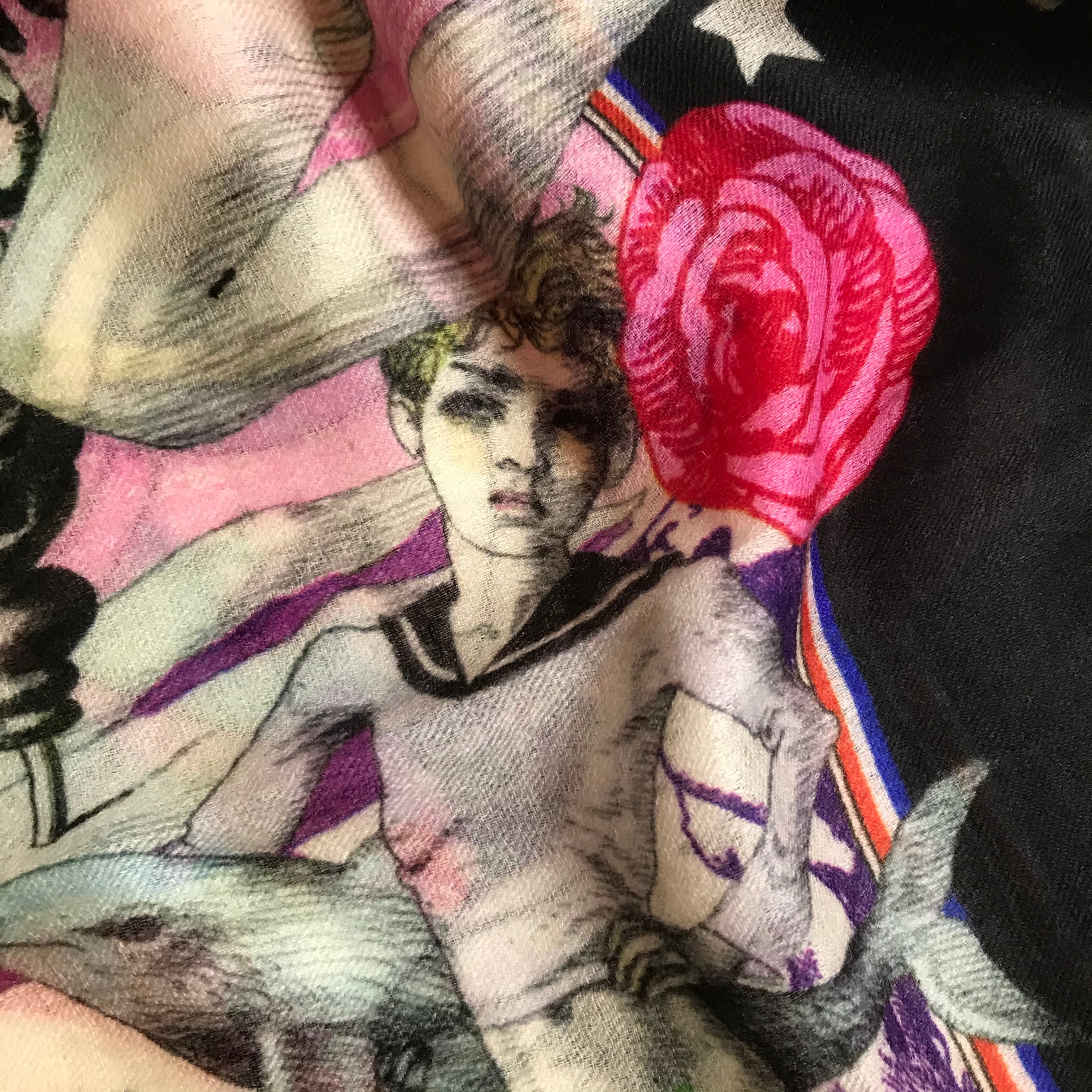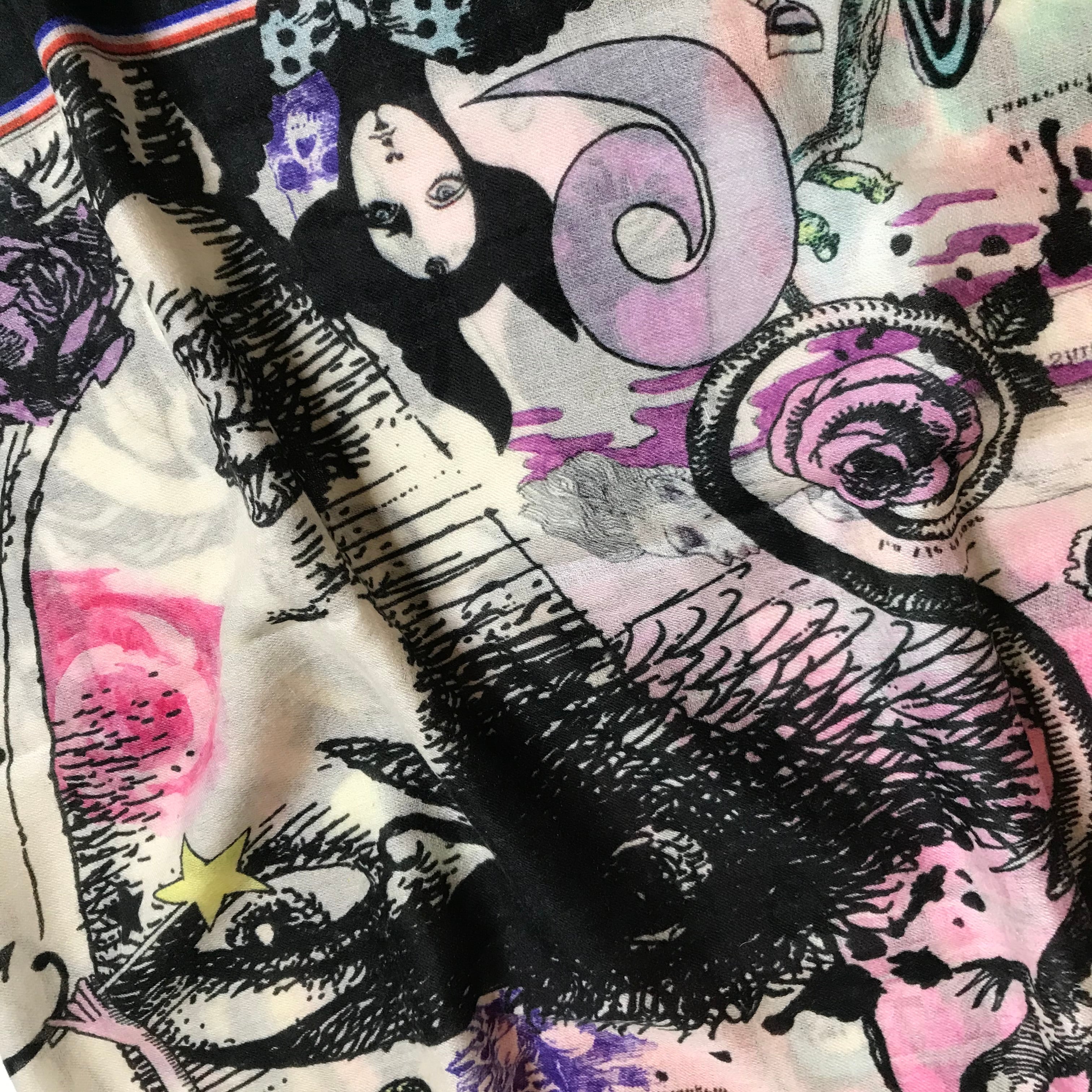 イラストレーション界の奇才、宇野亜喜良の贅沢でモード感あふれるシルクカシミヤ生地の大判ストールです。宇野氏監修のもと「ROCK」をテーマに、様々なシーンで使用された珠玉のイラストレーションの数々をコラージュしました。トップロックバンドのアートディレクションとして活躍し、宇野亞喜良を崇拝するデザイナーの秋田和徳氏が前面的に製作協力。ロックテイストあふれるスキャンダラスな魅力漂う大判ストールです。